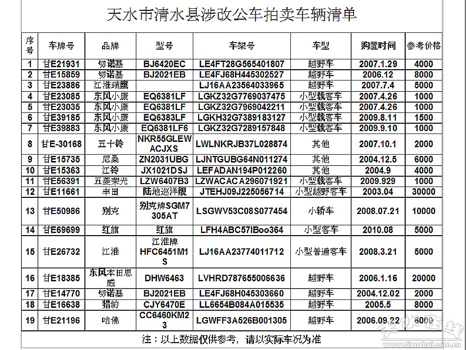 2、拍卖地点:天水市清水县水务局六楼会议室。