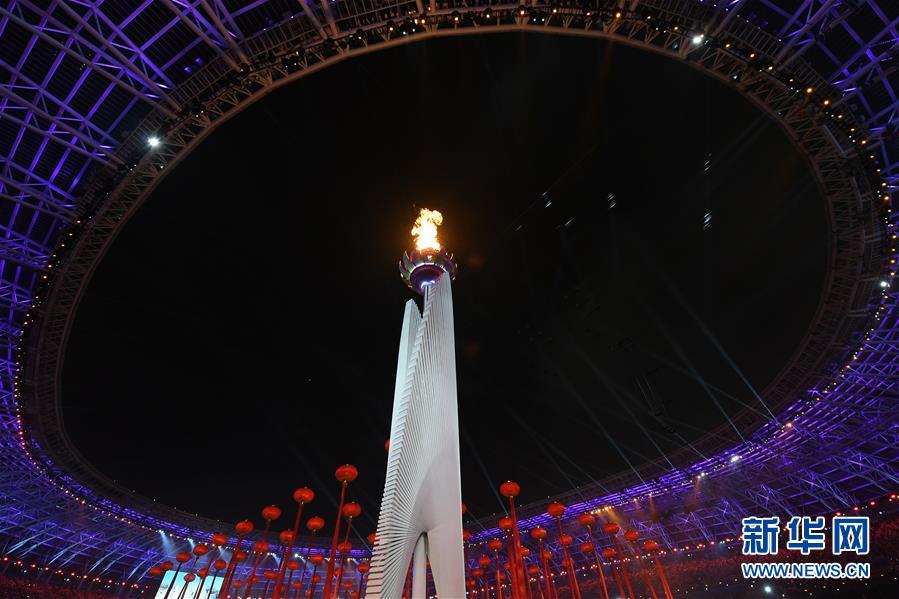 全运圣火在天津奥林匹克中心体育场熊熊燃烧。新华社记者李响 摄
