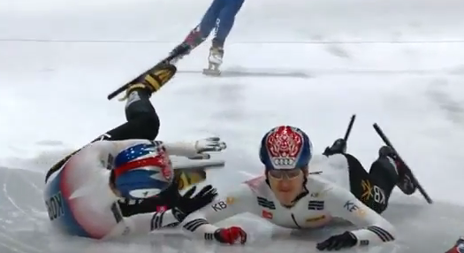 比赛还剩四圈时,韩国队杀了上来。交接时,韩国的徐一拉又想阻挡身后的中国选手武大靖,不但没把队友黄大恒推出去,还两手一拉把黄大恒拉倒了,两人双双摔趴在地。武大靖的前行路线也受到影响。