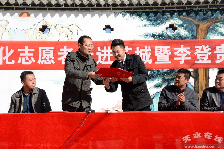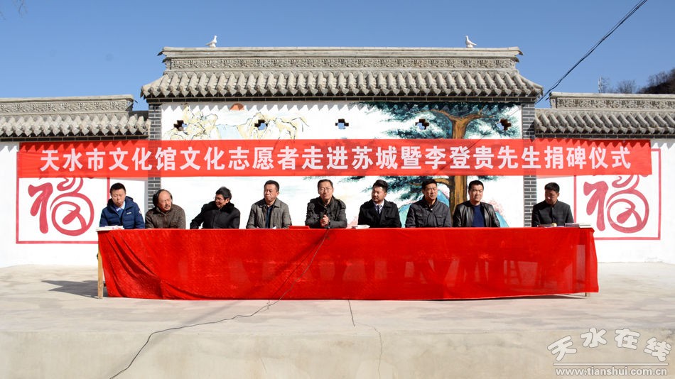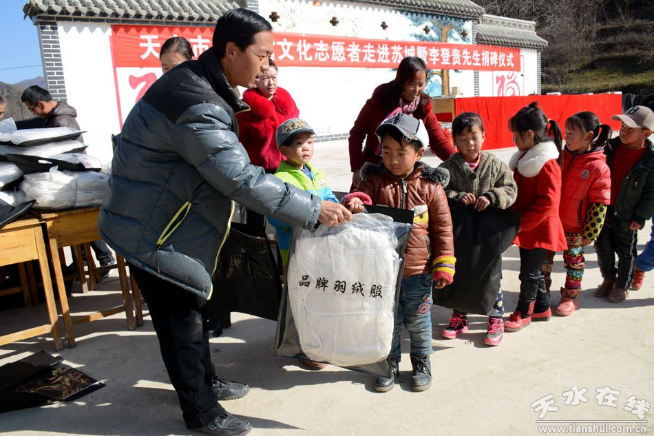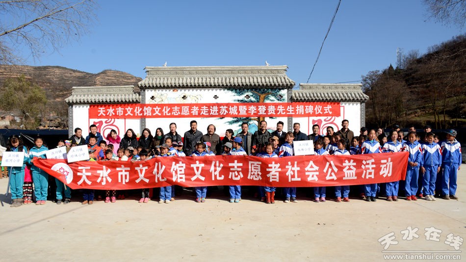 2017年11月24日上午11点,天水市文化馆文化志愿者一行15人来到了秦州区汪川镇苏城村,在这里举行“志愿者羽绒服爱心捐赠”和“李登贵先生捐碑”两项仪式。 天水市文化馆文化志愿者的到来,受到了当地汪川镇镇长王景中、苏城学区校长张连军以及乡镇干部、汪川镇银河小学、柏磨小学、珍珠小学、池塘小学全体师生、当地群众的热烈欢迎。