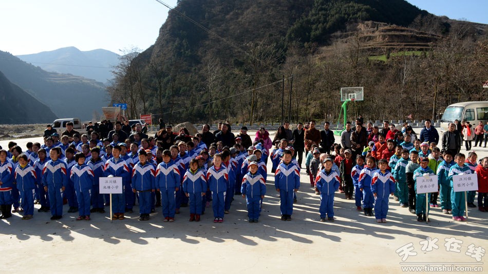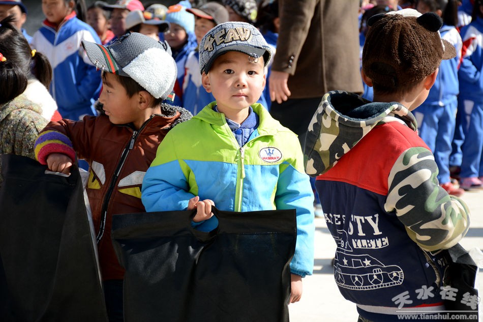 当得知天水市文化馆文化志愿者要为汪川镇学区四个小学的学生们捐赠120套羽绒服一事,所有师生早早地列好整齐的队伍等在了池塘小学的操场上,大家翘首以盼,当载着志愿者和捐赠物资的车辆驶入苏城村文化广场时,顿时响起了热烈的掌声,虽然寒风凛冽,但所有在场的师生、志愿者、当地乡镇干部以及乡亲们都被暖融融的爱意包围着。