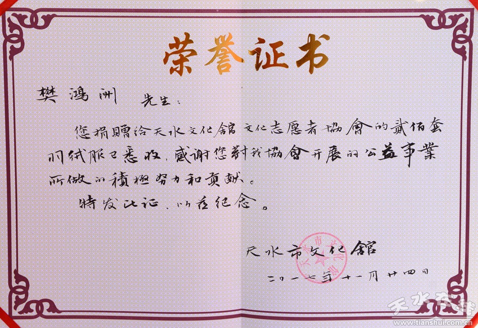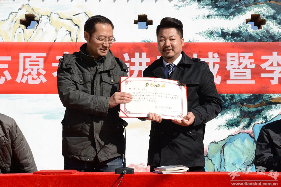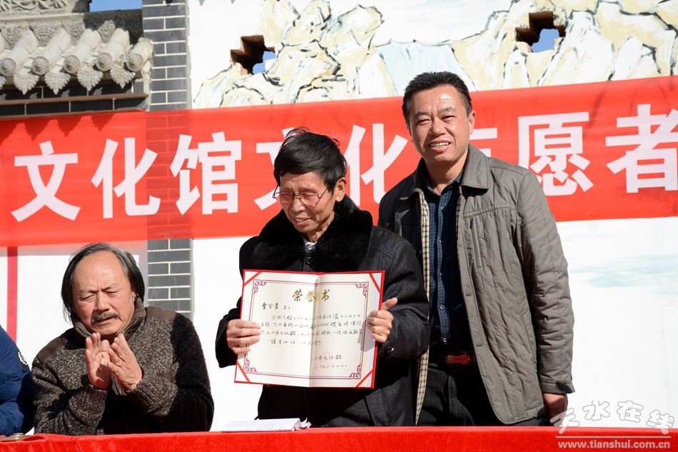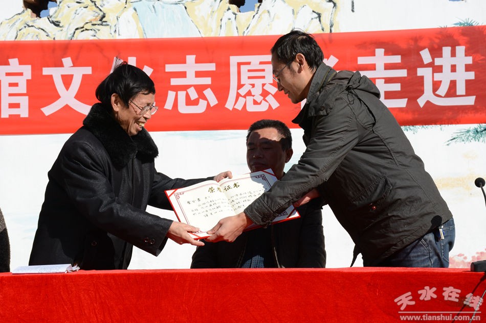 在这次活动中,天水市文化馆馆长李靖为两位爱心人士樊鸿洲先生和李登贵老先生颁发了捐赠证书。天水市文化馆文化志愿者走进苏城,为苏城学区四所小学的120名小学生捐赠羽绒服的爱心行动是天水市文化馆志愿者协会成立以来的首次爱心活动 ,为今后志愿者协会爱心活动打下了坚实的基础。