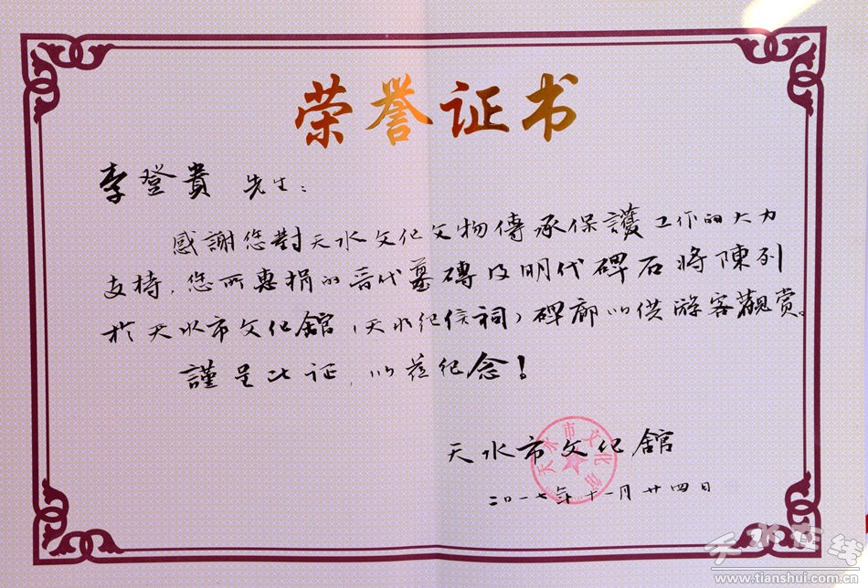如今的李登贵先生,已经是76岁高龄的他对保护“北魏墓志铭砖”和“大明国修路碑”,明显感觉到心有余而力不足了。在捐碑仪式的大会上,他深情地说:“这两块碑本来就是国家的,就让国家来珍藏和保护它们。”甚至他还形象而朴实地说把这两块宝贝捐给天水市文化馆也是真正地给两块宝贝找对了“婆家”。