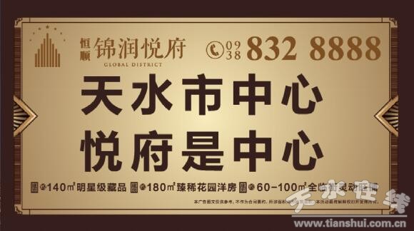 恒顺·锦润悦府是恒顺地产匠心雕琢的一部“瑰宝作品”,它落子天水整个城市能量最集中的板块,也就是成纪新城中央!“把世界繁华引入天水”是恒顺·锦润悦府的理想和使命!它在中央公园之上,锦润悦府更借鉴世界上层建筑的精粹,引入了国际名品商业,打造城央超大建筑集群生活平台!涵括了7C写字楼、国际商街、七星级会所、I MAX影院、精装SOHO公寓、电梯花园洋房、公园别墅等多元业态,它将成为天水“市中心”!