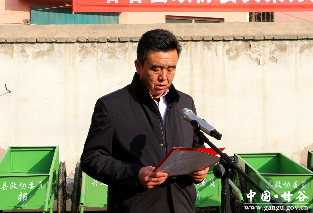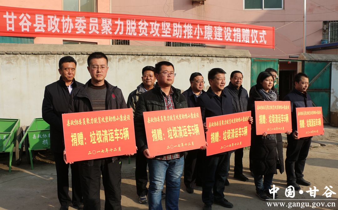 12月21日,甘谷县政协委员“聚力脱贫攻坚助推小康建设” 垃圾清运车捐赠仪式在新兴镇农机厂举行,为大像山镇、安远镇、金山镇等11乡镇14个贫困村捐赠垃圾清运车70辆。县政协主席马骥,副主席董成斌、田小龙、郑建子、马清平出席捐赠仪式;各委办负责人、结对帮扶委员及受捐村所在的11个乡镇有关负责人参加活动。