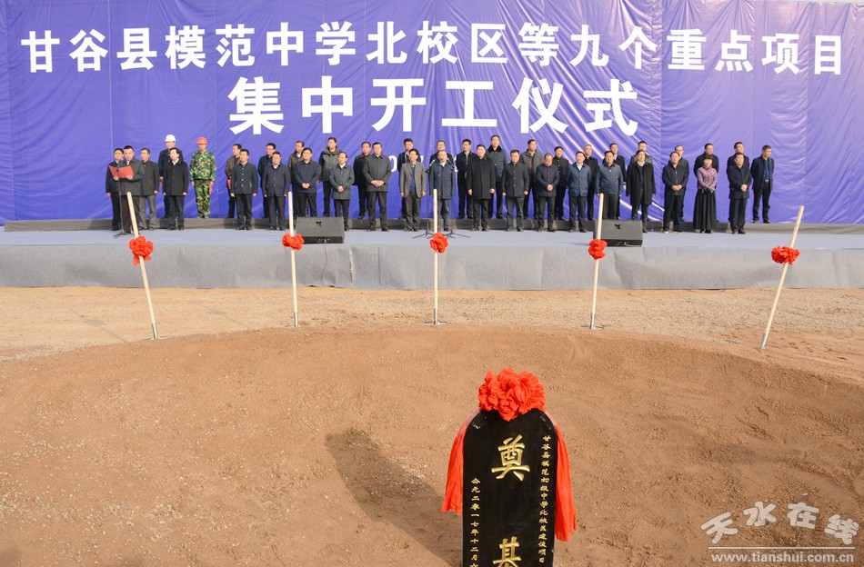 12月6日,甘谷县模范中学北校区等9个重点项目集中开工。市委书记王锐宣布项目开工。市领导王军、张明泰、蒋晓强、张克强出席开工典礼并为工程奠基。