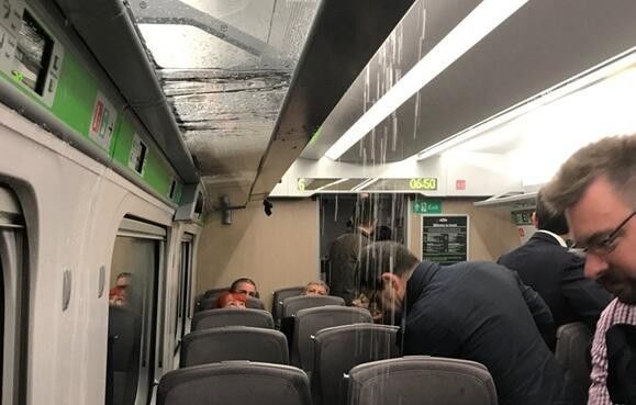 随后,车内空调突然严重漏水,车厢瞬间变成“水帘洞”。花费204英镑(约合人民币1781元)高价购买坐票的乘客们不得不站起来“避雨”,还有乘客的笔记本电脑因为进水而损坏。