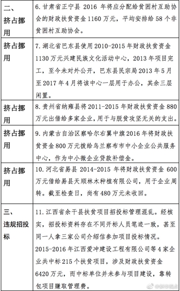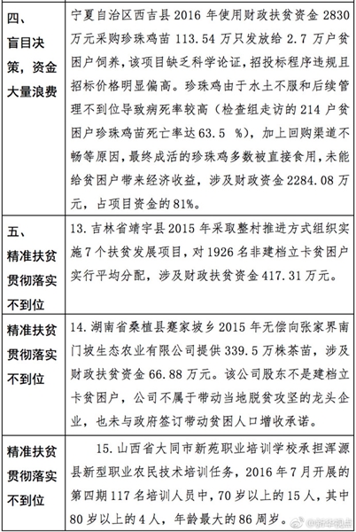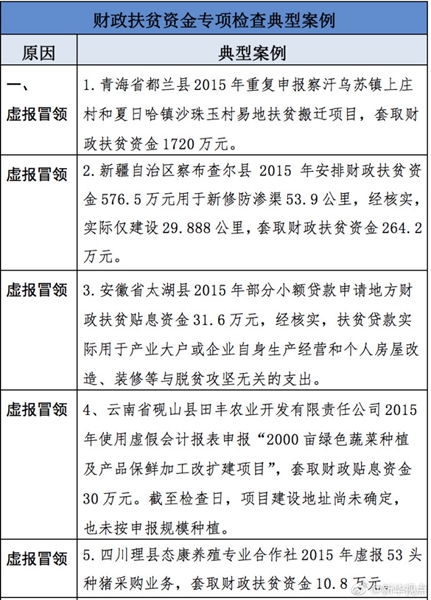 “发现一起、查处一起、绝不姑息!”财政部监督检查局有关负责人指出,此次检查发现了一批违法违规问题,本着“零容忍”态度已进行了严肃处理。从检查发现问题中的一些典型案例看,虚报冒领、挤占挪用、违规招投标、盲目决策导致资金大量浪费、精准扶贫贯彻落实不到位是当前滥用扶贫资金的主要问题所在。