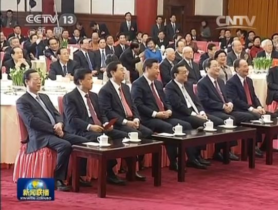 虽然通稿里在提到全体合唱时用了“最后”做前缀,不过,政知道(微信ID:upolitics)发现,今年合唱并非整个茶话会的最后环节,合唱结束后,习近平上台同包括俞正声在内的十二届全国政协主席、副主席一一握手。