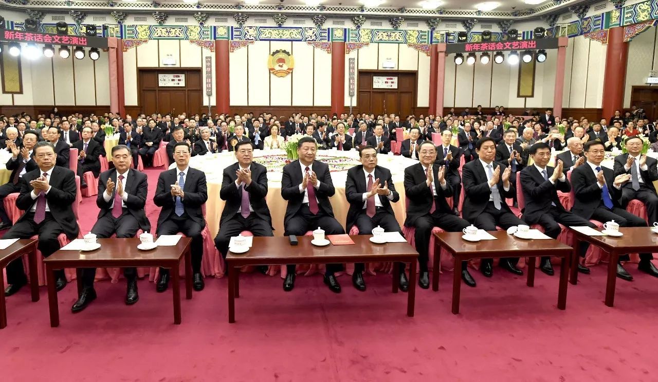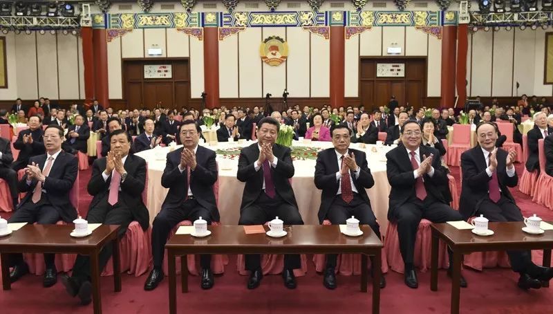 党和国家领导人习近平、李克强、张德江、俞正声、张高丽、栗战书、汪洋、王沪宁、赵乐际、韩正等同各民主党派中央、全国工商联负责人和无党派人士代表、中央和国家机关有关方面负责人以及首都各族各界人士代表欢聚一堂,共迎2018年元旦。