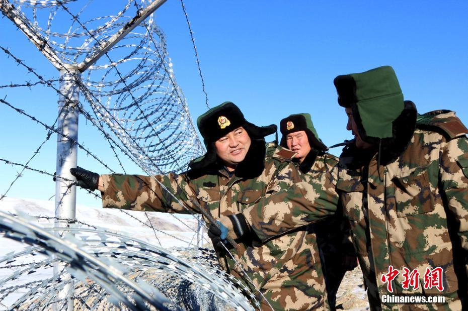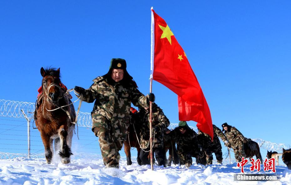 12月30日,驻守在祖国西北边陲的武警新疆阿勒泰边防支队托普铁热克边防派出所官兵,在中哈边境一线的雪原上巡逻踏查,以维护元旦假期边境的安宁。王友波 摄