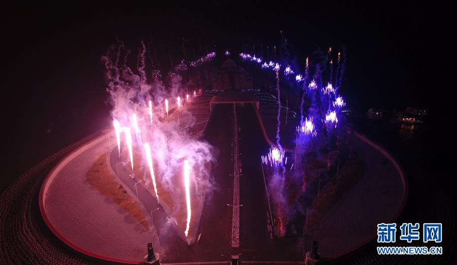 12月31日,港珠澳大桥东人工岛上燃放烟花庆祝主体工程全线亮灯。