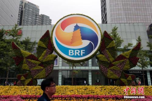 资料图:2017年5月8日,北京建国路上的“一带一路”主题花坛。 中新社记者 李慧思 摄