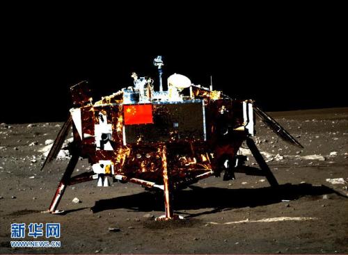 资料图:嫦娥三号着陆器及器载五星红旗图片。该图是由月球车上全景相机拍摄的。新华社发(国防科工局供图) 图片来源:新华网