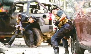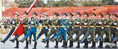 7时33分,编队走出金水桥,齐步换正步行进。3名分队长拔刀出鞘,行举刀礼。同一时间,90名队员由肩枪换为端枪,威武前行。