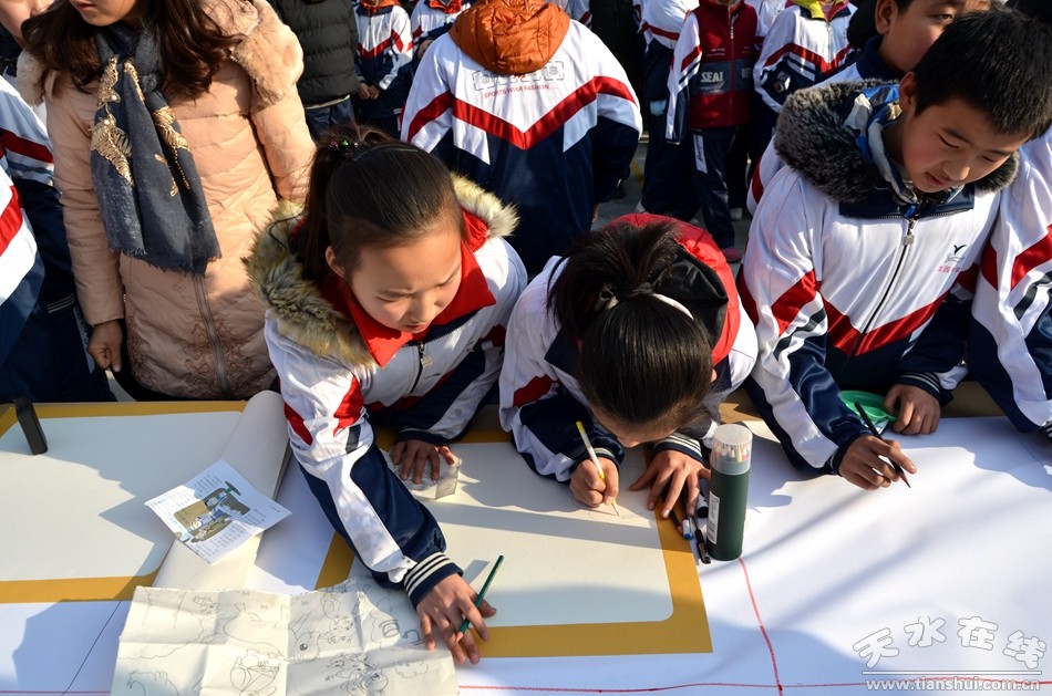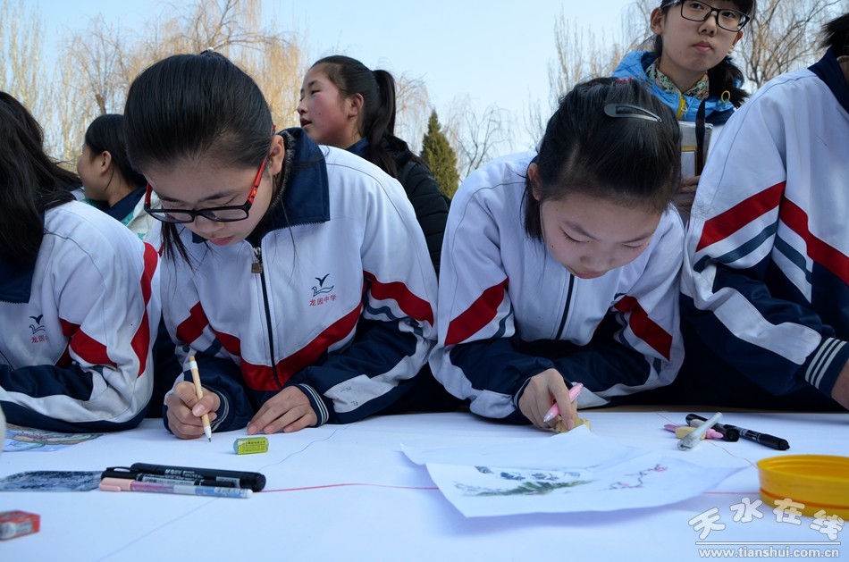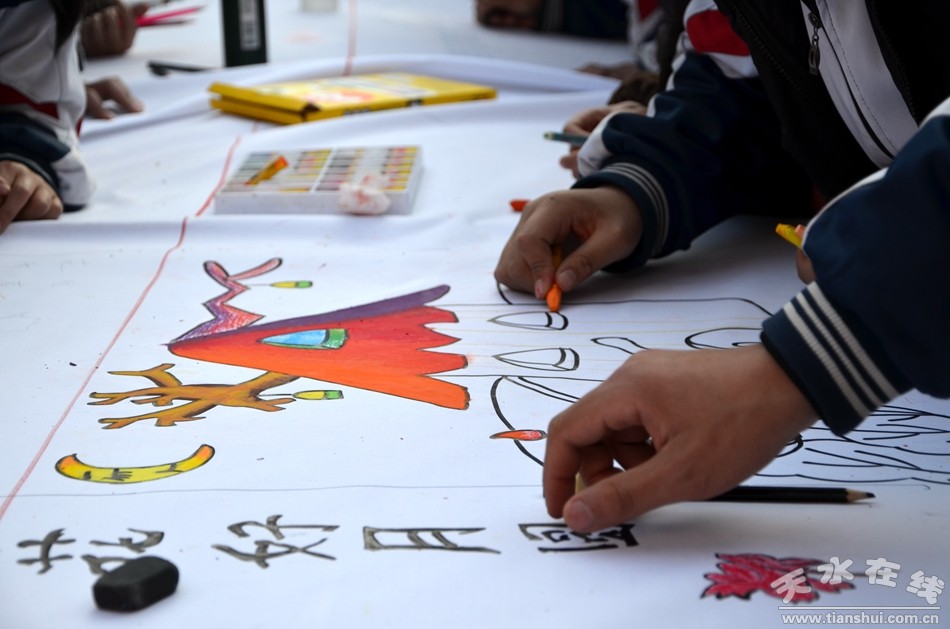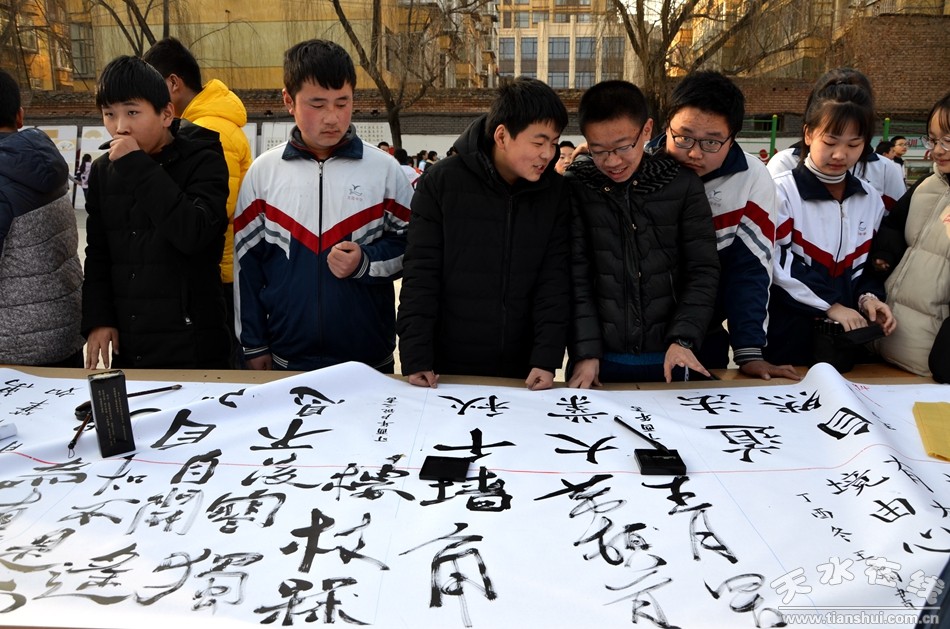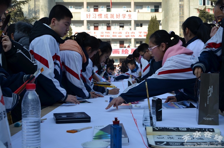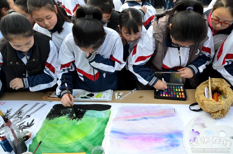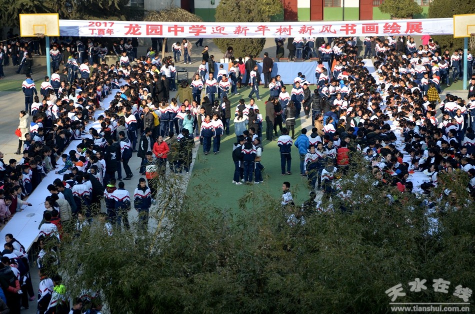 12月27日,天水市麦积区龙园中学300余名师生现场作画,书法、国画、水粉、素描等形色各异的艺术创作,铺满了200米长的画卷。