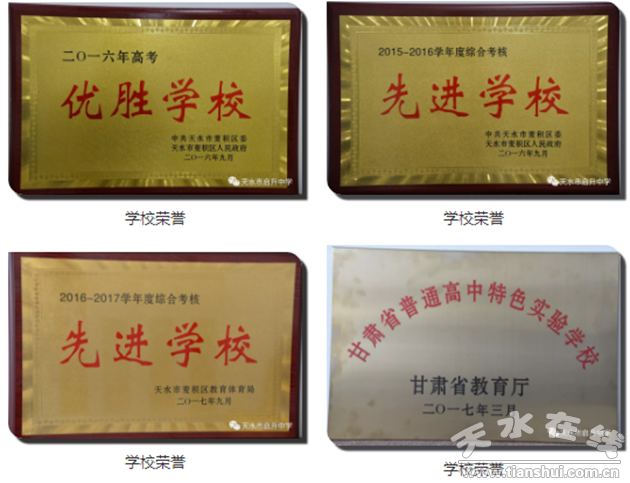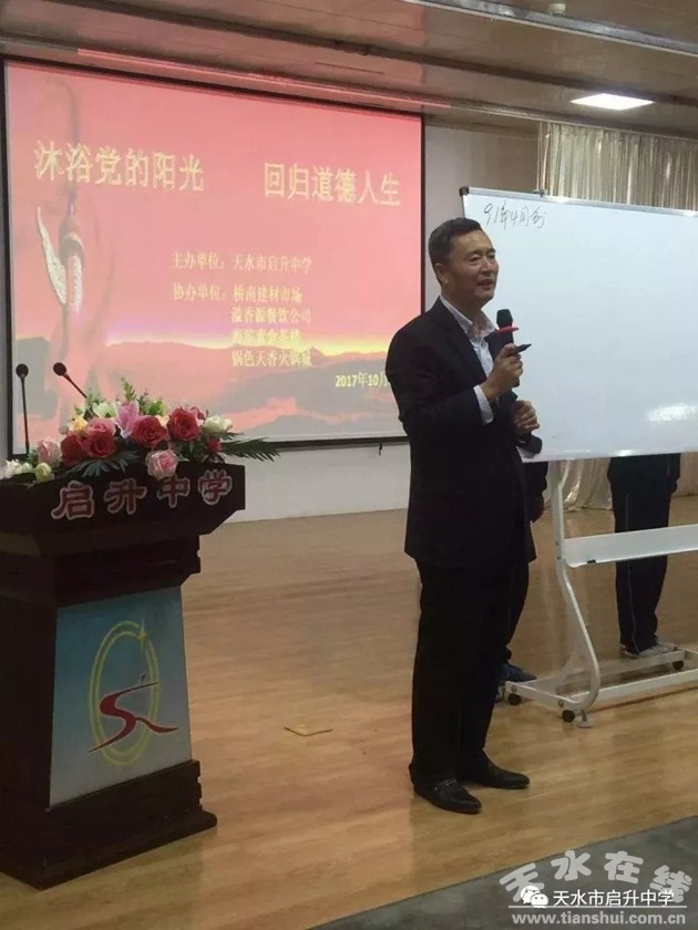 2017年是我校拼搏奋进创造辉煌的一年。在全校师生的共同努力下,天水市启升中学被甘肃省教育厅评为“甘肃省普通高中特色实验学校”。于2017年4月13日我校特邀著名教育家魏书生老师来我校给全体教师从学校管理、班级管理及班主任工作、语文教学实践案例分享做了专题讲座。这一讲座坚固了我校提质强校的决心,对于提高我校教师思想认识以及教学水平具有深远的影响。2017年10月20日特邀著名企业家、慈善家、教育家王竑锜来我校给全校师生做了“沐浴党的阳光,回归道德人生”的专题讲座。弘扬国学精粹,传递了传统文化,托举了我校扎实推进学习国学的热潮。2017年11月16日,天水市委常委、组织部长王正茂带领天水市两区五县的组织部门一行莅临我校督查指导我校基层党建工作。视察了学生食堂、学生宿舍。观摩了各高考专业生的专业课堂训练,对学校的党建工作及教育教学管理给予了肯定和表扬。