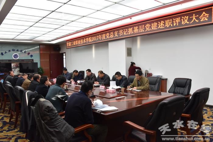 为全面学习贯彻党的十九大精神,深入贯彻落实习近平新时代中国特色社会主义思想,按照新时代党的建设的总要求推动全面从严治党向高校基层延伸,促进基层建设全面进步、全面过硬,强化学校基层党组织、特别是党总支书记管党治党责任,推动落实全校基层党建工作各项目标任务完成,根据省教育厅党组、省高校工委《关于做好2017年度高校院系及党总支书记抓基层党建述职评议考核工作的通知》要求,按照天水市委组织部、市直机关工委的工作安排和学校党委关于《学校基层党总支书记抓基层党建述职评议考核实施方案》。12月28日下午,甘肃工业职业技术学院在该校图书馆4楼会议室召开2017年度党总支书记抓基层党建述职评议会议。学校八个二级学院及机关总支书记进行述职,天水市市直机关工委书记雒建明、副调研员周进录出席,该校领导杨声、曹爱明、郭建忠及学校各部门负责人和该校市政协委员参加评议。会议由该校校党委副书记郭建忠主持。