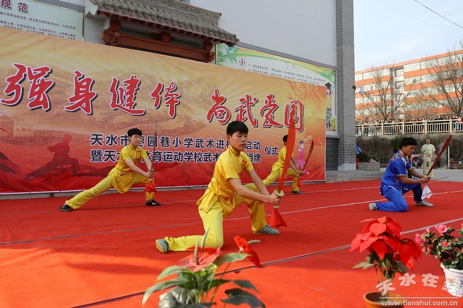 12月28日下午,以“强身健体 尚德爱国”为主题的武术进校园启动仪式暨天水市体校武术教学点授牌仪式在天水市枣园巷小学举行。本次活动,是学校打造校园传统文化特色,落实立德树人教育理念的重要举措。旨在通过对少儿武术兴趣爱好的培养,大力推进武术文化在少年儿童中的普及和传播,促进少年儿童的健康成长和全面发展,切实地推动武术教育文化的传承与发展。