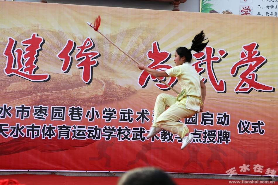 仪式上,天水市体校陈玉洪校长为学校武术教学点授牌并为武术教练员颁发了聘任证书。枣园巷小学学生展示了武术操、五步拳和武术套路等教学成果,孩子们精彩的表演赢得与会领导嘉宾的高度肯定,鼓励大家勤学苦练,强健体魄,为继承和发扬中华优秀传统文化做贡献。天水体校专业武术运动员为来宾和师生展示了精彩的武术表演,体校教师还进行了现场观摩教学。