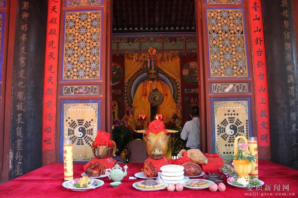 群峰叠翠,渭水欢歌。6月21日上午,麦积区卦台山上彩旗飘飘、礼乐声声、香烛萦绕、翠柏掩映,一片庄严肃穆、吉庆祥和的氛围。由当地各界群众自发组织的2017(丁酉)年民间祭祀中华人文始祖伏羲典礼在这里隆重举行。