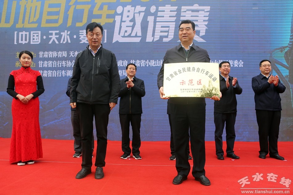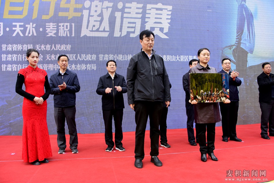 发车仪式上,甘肃省自行车运动训练管理中心主任、自行车运动协会副主席刘顺义为麦积区分别授“甘肃省全民健身自行车运动示范区”、“甘肃省自行车运动训练基地”牌。