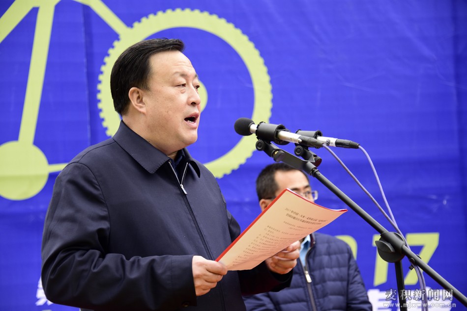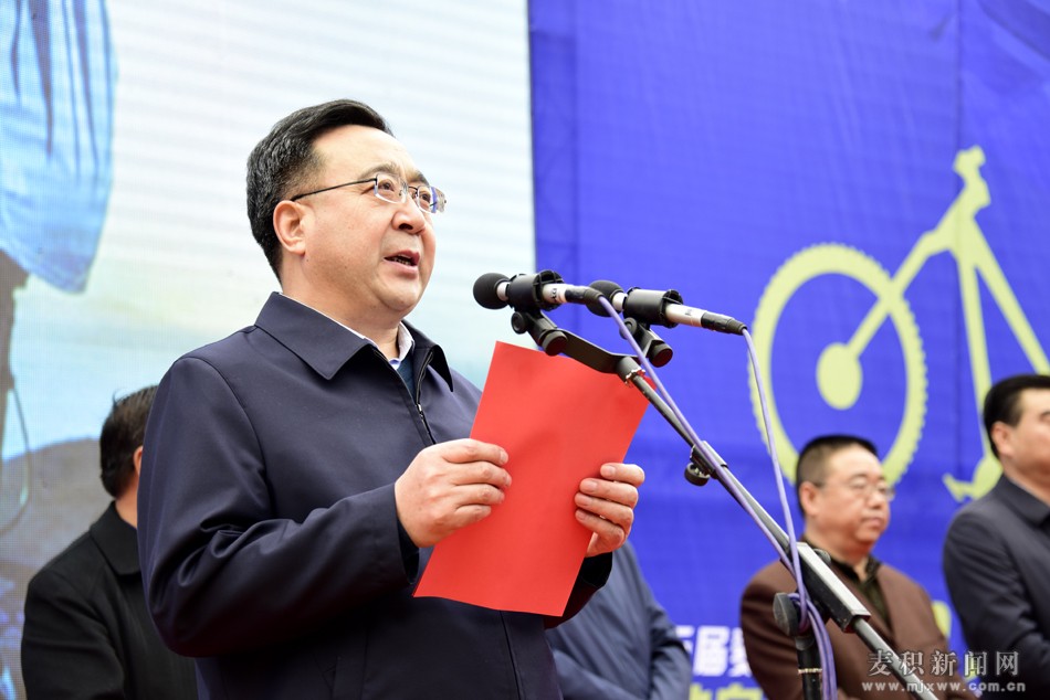 市政府副市长张建杰讲话。他代表中共天水市委、市人大、市政府、市政协向本次比赛的开赛表示热烈祝贺,向出席今天发车仪式的各位领导、各位来宾及参赛运动员、裁判员表示诚挚问候,向为本次比赛给予大力支持的社会各界人士表示衷心感谢。张建杰说,今天在麦积区举办的“麦积山杯”全国山地自行车邀请赛,是我市依托国家5A级景区麦积山,精心打造的本土品牌赛事,已经举办了四届,具有广泛的影响力,是全国体育旅游精品赛事。举办好本次比赛,对于丰富广大群众文化体育生活,推动天水体育文化旅游融合发展,提升天水对外知名度和影响力具有十分重要的意义。