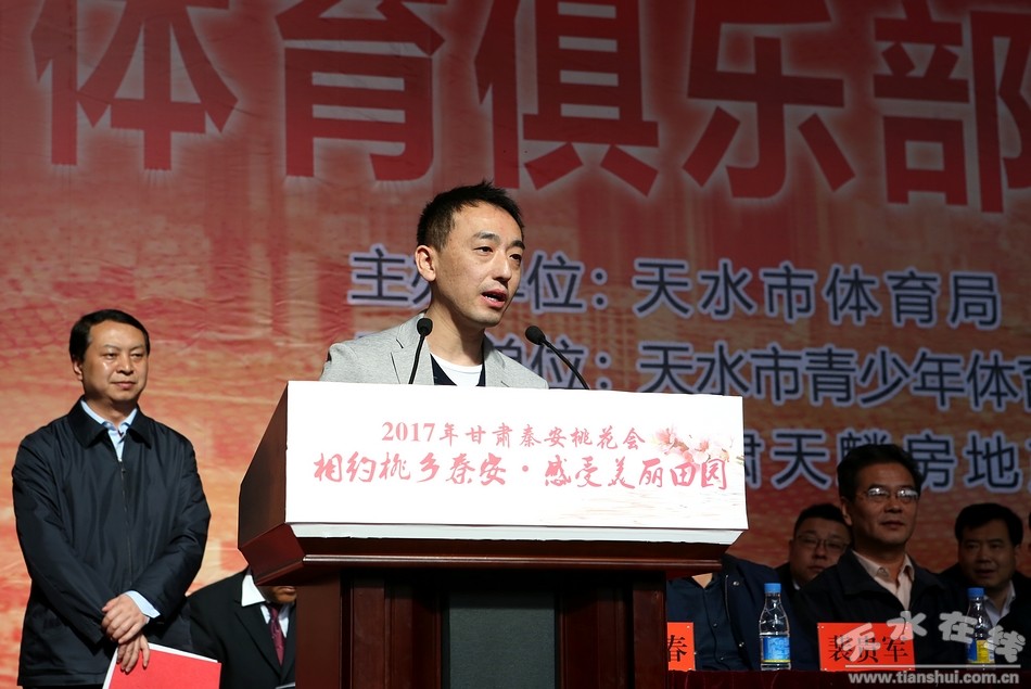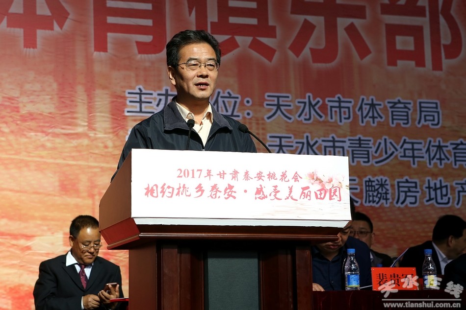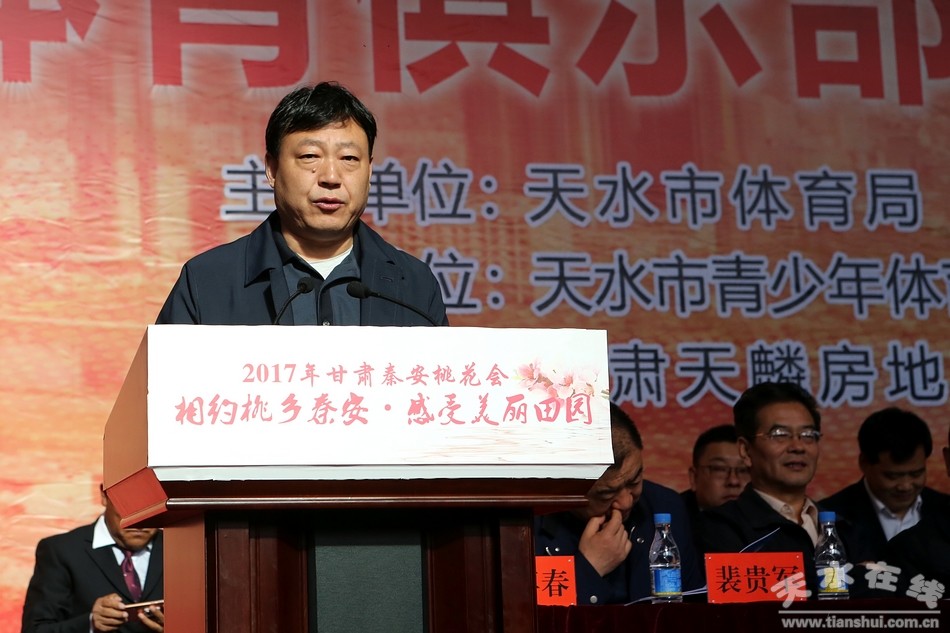 黄啸在致辞中说,中国·秦安首届“天麟集团·桃花杯”体育俱乐部乒乓球比赛是今年秦安县“桃花会”各项活动中参与范围广、比赛水平高、宣传作用大的一项全国性高水平的体育赛事,举办好本次比赛对于促进体育与文化旅游产业融合发展,展示秦安乃至天水改革发展新成就,提升天水对外影响力和知名度具有十分重要的意义;希望赛事组委会周密组织精心服务全力做好各项保障工作努力把比赛办成隆重热烈、和谐文明、精彩纷呈的盛会。希望广大参赛运动员充分发扬奥林匹克精神,团结友爱、奋力拼搏,赛出风格,赛出水平!也希望更多的社会组织和有识之士进一步关心关注我市体育事业发展,共同谱写天水体育事业发展新篇章!