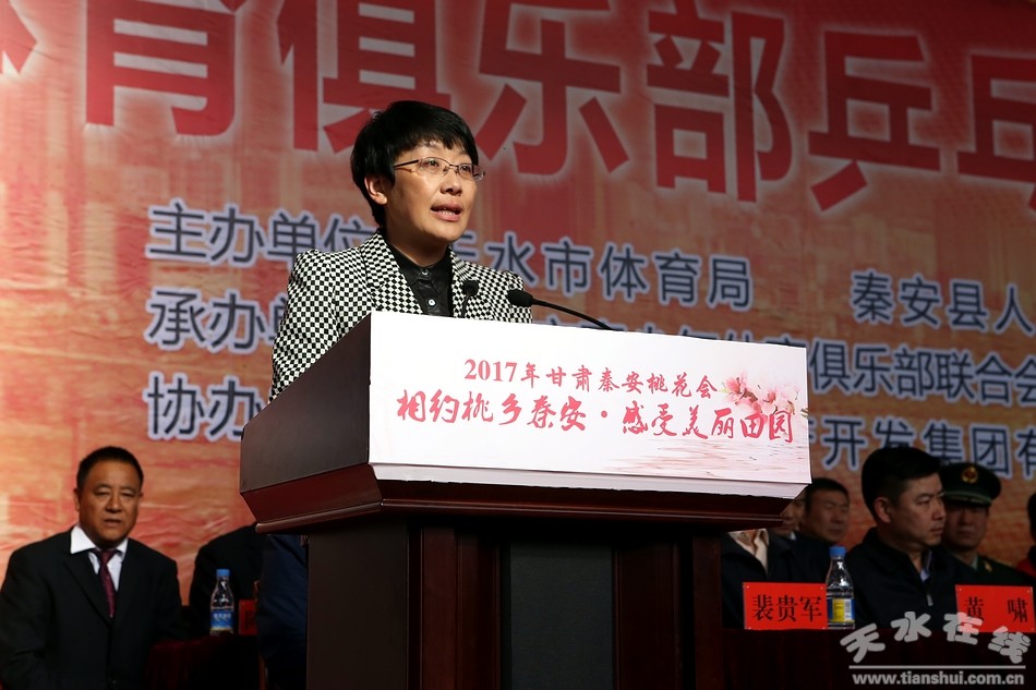 程江芬在致辞中说,在2017年甘肃秦安桃花会之际,为了更好的展示秦安对外开放形象,中国·秦安首届“天麟集团·桃花杯”体育俱乐部乒乓球比赛正式拉开帷幕,这既是2017年甘肃秦安桃花会的一项重要内容,也是秦安体育运动发展的一件盛事。该赛事的成功举办将会为广大观众带来一场世界级高水平的乒乒球体育盛宴。我们将竭诚服务,确保本次比赛圆满成功。同时,也希望全体运动员、教练员、裁判员和工作人员遵循“更快、更高、更强”的体育精神和“公开、公正、公平”的竞赛原则,坚持友谊第一,奋力拼搏,赛出风格,赛出水平!