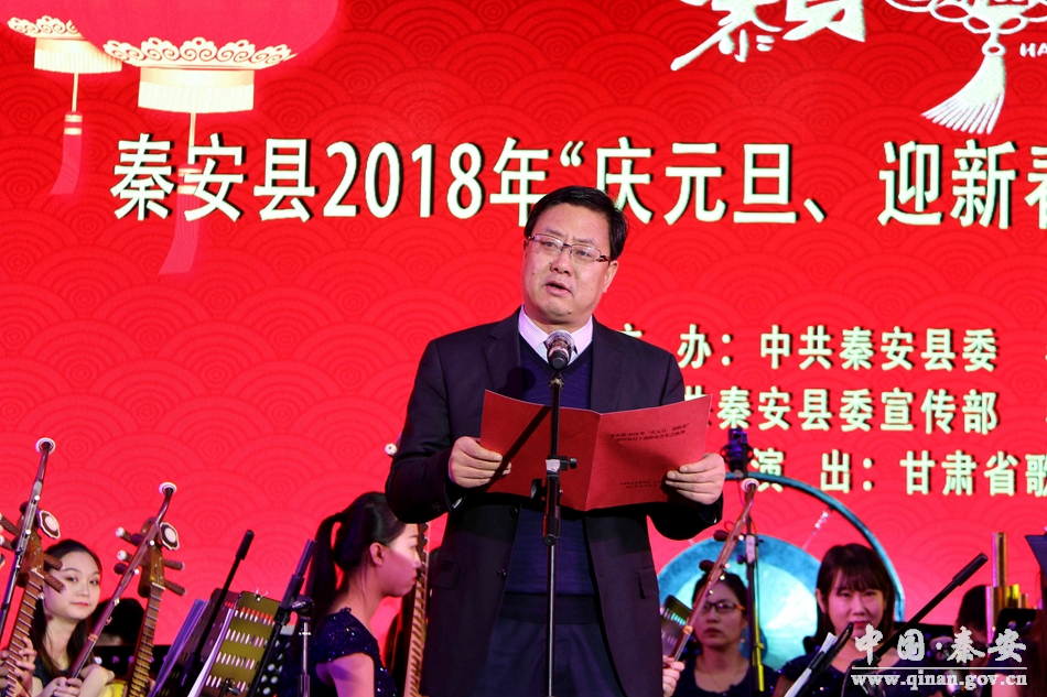 演出开始前,县委书记王东红作了致辞。王东红首先代表中共秦安县委、县人大、县政府、县政协,向全县广大环卫工人、公安干警、综合执法干部、消防官兵和精准扶贫一线的工作人员等基层一线干部职工和离退休老干部代表,以及长期关心支持秦安经济社会发展的各级领导、各界人士致以新春的问候和美好的祝愿!向甘肃省歌舞剧院全体演职人员表示热烈的欢迎和衷心的感谢!他说,即将过去的一年,县委、县政府坚持以脱贫攻坚统揽经济社会发展全局,抢抓机遇,真抓实干,县域经济稳步增长、城乡面貌日新月异、各项改革深入推进、民生事业全面改善、党的建设不断加强、精神文明建设硕果累累、社会大局和谐稳定,全县经济社会发展进入了一个崭新的阶段,为进一步加快发展奠定了坚实基础。