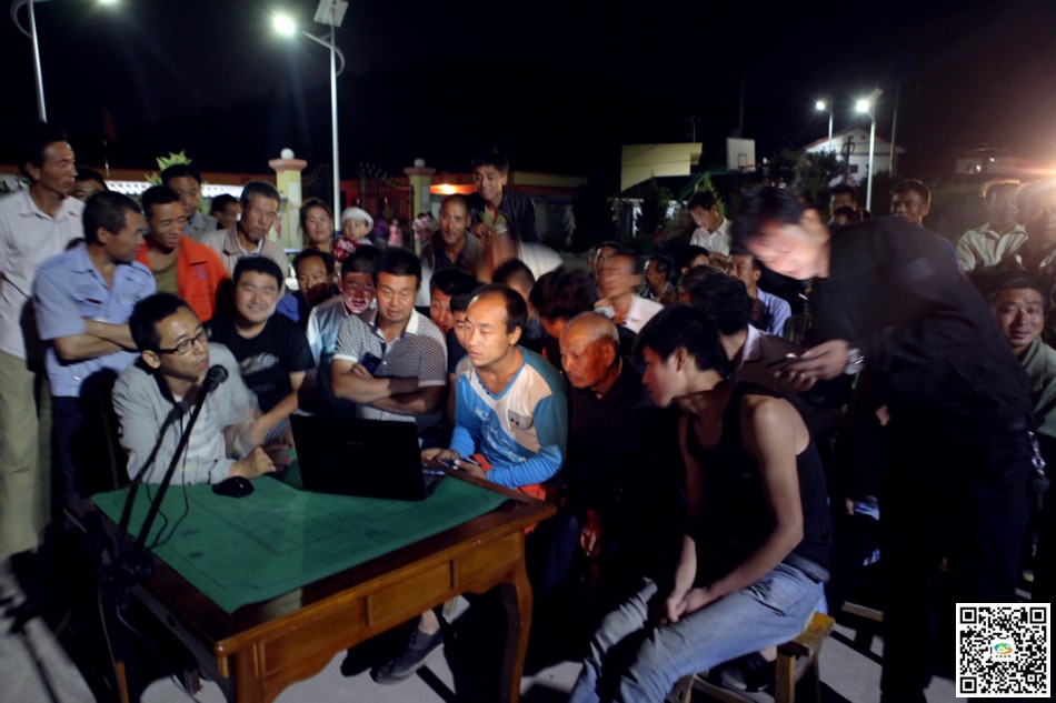 ▲365bet现金开户技术人员在村文化广场为水泉村村民讲解微信直销自家青皮核桃的方法。