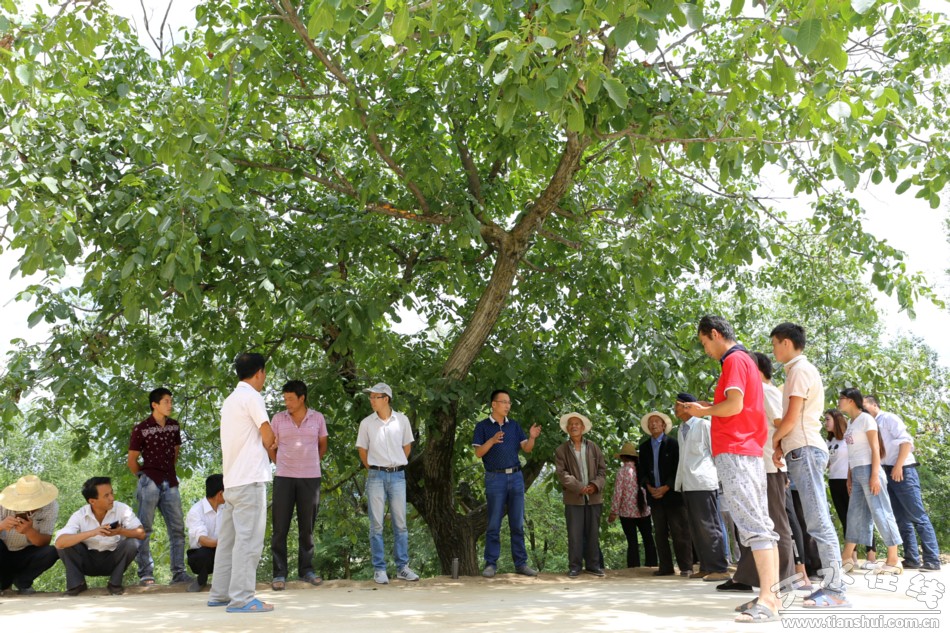 ▲清水县商务局局长张伟在田间地头为田湾村村民讲解微信直销自家青皮核桃的方法。
