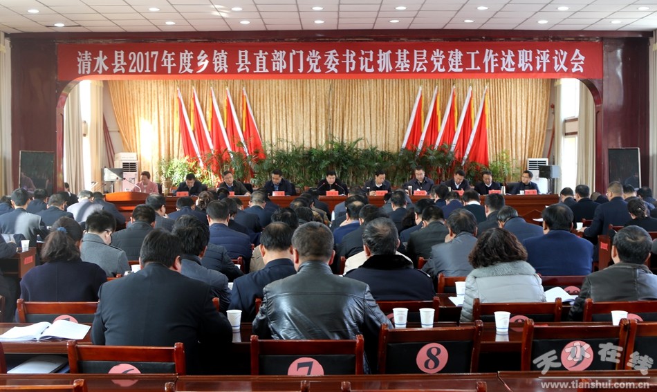 12月27日,清水县召开2017年乡镇和县直部门党委书记抓基层党建工作述职评议大会。市人大常委会副主任、清水县委书记刘天波主持会议并强调,全县各级党委要认真学习宣传贯彻党的十九大精神,以习近平新时代中国特色社会主义思想为指引,准确理解和全面贯彻新时代党的建设总要求,以提升组织力为重点,着力强化措施,狠抓任务落实,切实把基层组织建设成为推动全县经济社会发展的坚强战斗堡垒。