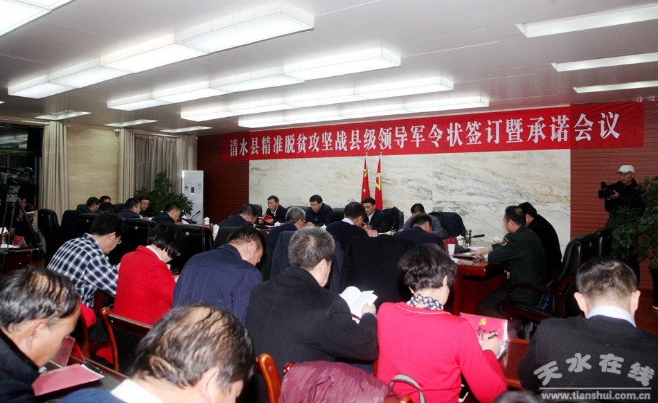 12月27日晚,市人大常委会副主任、清水县委书记刘天波主持召开全县精准脱贫攻坚战县级领导军令状签订暨承诺会议。明确县级领导2018年各自的脱贫攻坚责任,以上率下打好明年的精准脱贫攻坚战,给县委、县政府和全县人民交一份满意的答卷。