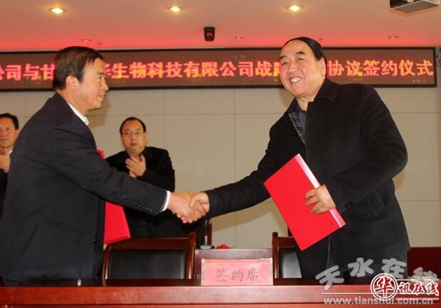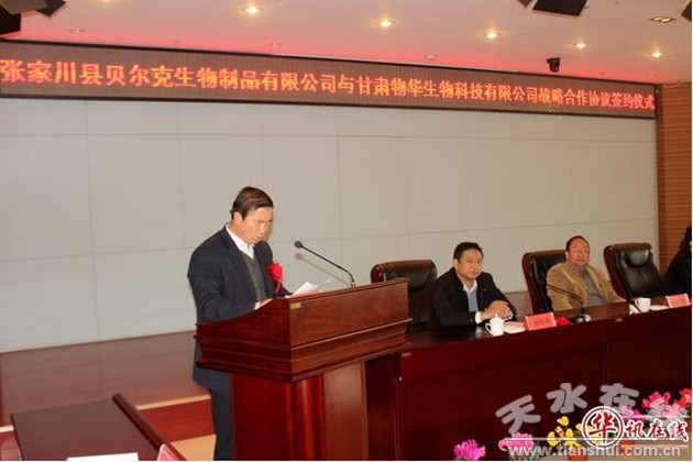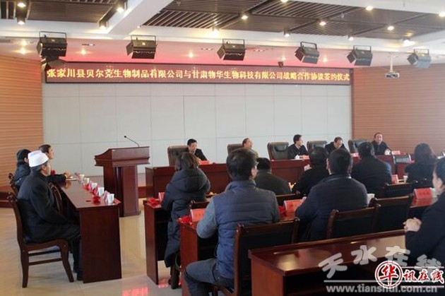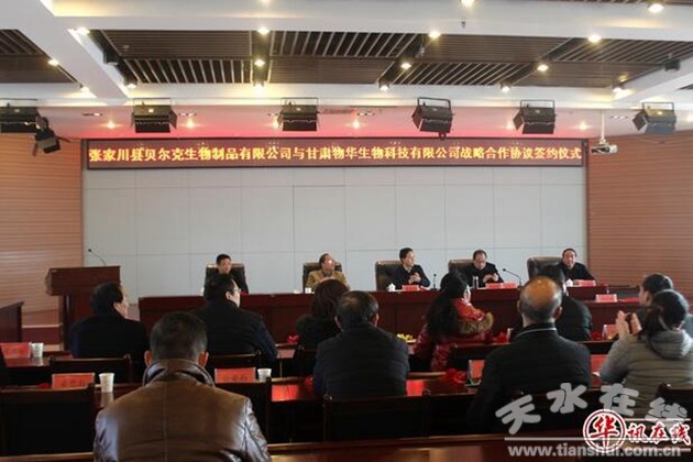 12月27日上午,张家川县贝尔克生物制品有限公司与天宝集团甘肃物华生物科技有限公司签订战略合作协议。天水市中小企业局局长杨志刚,张家川县委常委、统战部长李国恩,张家川县政府副县长马庭坚,天水市江苏商会会长、天宝集团董事长柏传祥出席签约仪式。