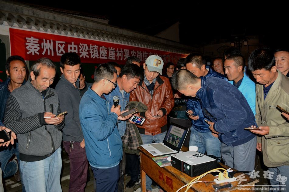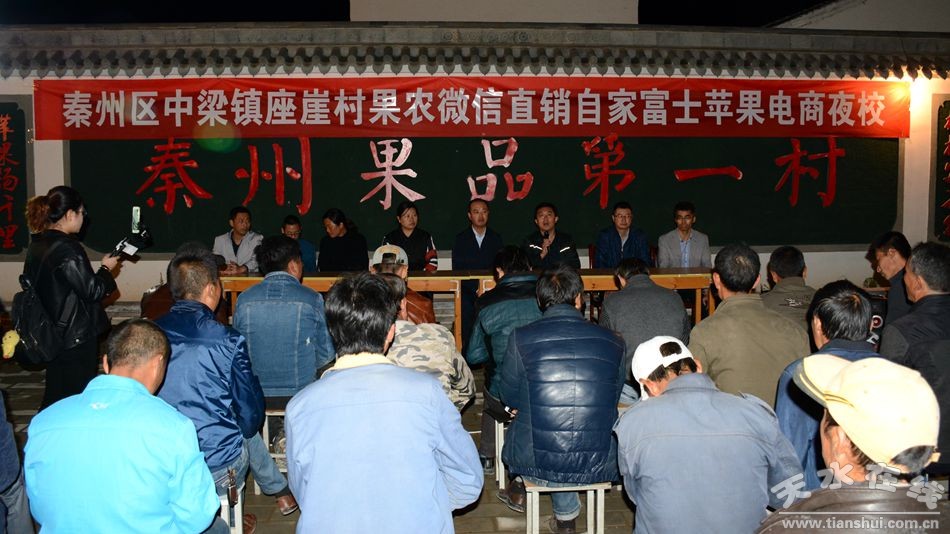 (9月27日晚,由365bet现金开户、中梁镇政府和秦州区商务局举办的中梁镇果农微信直销自家苹果电商夜校在秦州果品第一村座崖村开班授课。)