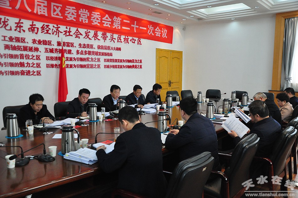 会议听取了区八届人大二次会议筹备情况、区政协八届二次会议筹备情况以及关于中央环境保护督查反馈意见整改问题清单销号有关工作的汇报,研究审定了《区人大常委会工作报告(审议稿)》、《区政府工作报告(审议稿)》、《区人民法院工作报告(审议稿)》、《区人民检察院工作报告(审议稿)》、《秦州区2017年国民经济和社会发展计划执行情况及2018年国民经济和社会发展计划(草案)的报告(审议稿)》、《秦州区2017年财政预算执行情况和2018年全区预算(草案)的报告(审议稿)》、《政协天水市秦州区第八届委员会常务委员会工作报告(审议稿)》、《天水市秦州区深度贫困村脱贫攻坚实施方案(2018—2020年)》、《天水市秦州区学习宣传十九大精神实施意见》、《关于秦州区开展农村资源变资产资金变股金农民变股东改革试点工作实施方案》、《秦州区健全完善城镇管理及环境监管网格化实施方案》、《秦州区关于进一步加强和改进机关党的建设工作的实施意见(试行)》、《秦州区关于深化律师制度改革实施意见》和《秦州区关于加快全区公证机构改革发展的意见》,研究审定了拟表彰命名的秦州区道德模范候选人名单。