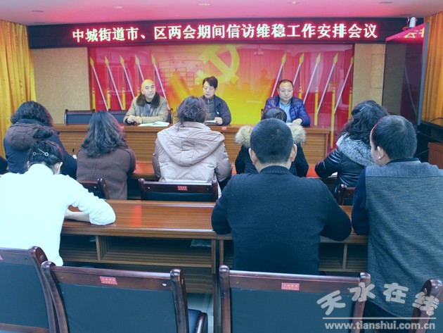 12月23日上午,中城街道召开了市、区两会期间信访维稳工作安排会。会上,街道主要领导传达了秦州区信访工作联席会议精神,宣读了《2017年11月份全区信访工作情况通报》,并就街道市、区两会期间信访维稳工作进行了安排部署。