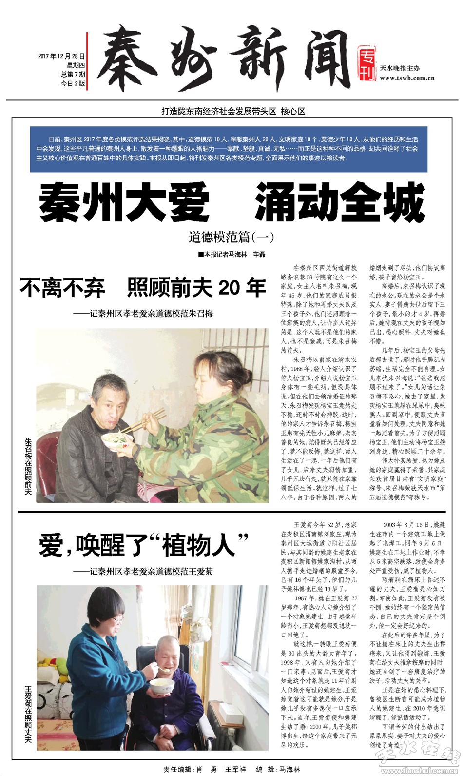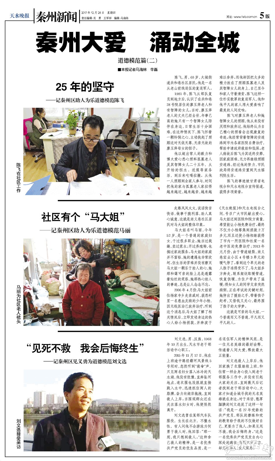 (秦州区外宣办)日前,秦州区2017年度各类模范评选结果揭晓。其中,道德模范10人,奉献秦州人20人,文明家庭10个,美德少年10人。从他们的经历和生活中会发现,这些平凡普通的秦州人身上,散发着一种耀眼的人格魅力——奉献、坚毅、真诚、无私……而正是这种种不同的品格,却共同诠释了社会主义核心价值观在普通百姓中的具体实践。本报从即日起,将刊发秦州区各类模范专题,全面展示他们的事迹以飨读者。(记者 马海林 辛磊)
