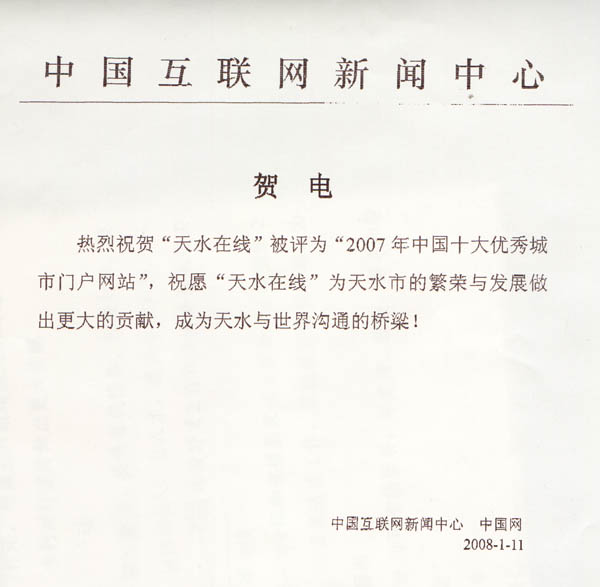 2008年1月11日,由中国互联网协会网络营销工作委员会、《IT时代周刊》、国家外文局《网络传播》共同主办的“2007中国十大优秀城市门户网站”评选活动结果隆重揭晓。