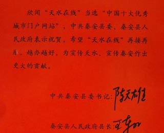 中共天水市秦州区委 秦州区人民政府发来贺电