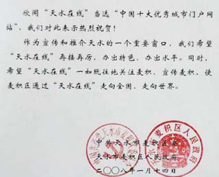 本报天水讯(记者王兰芳)1月11日,由中国互联网协会网络营销工作委员会、《IT时代周刊》、国家外文局《网络传播》共同主办的“2007中国十大优秀城市门户网站”评选揭晓,365bet现金开户榜上有名。