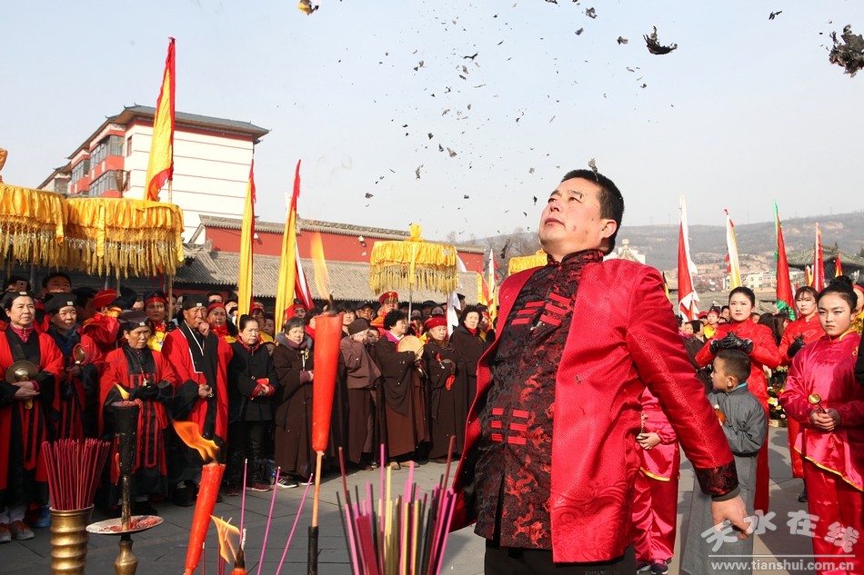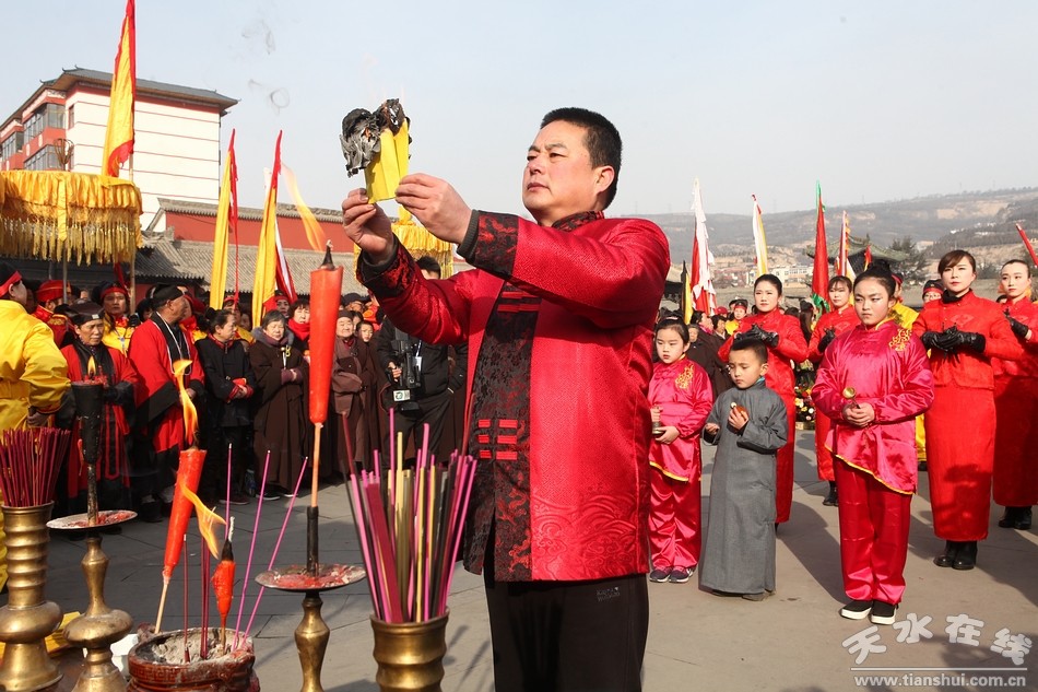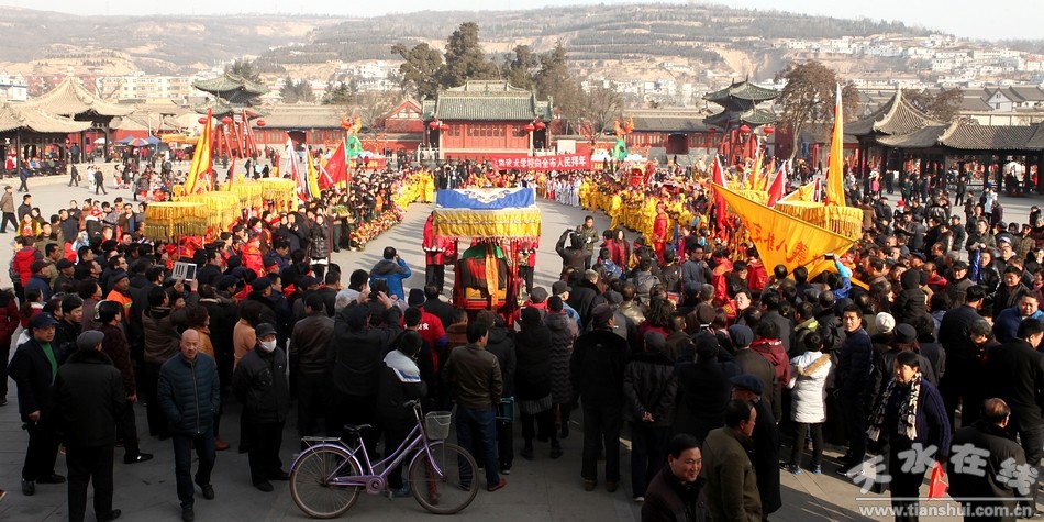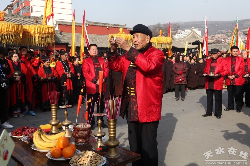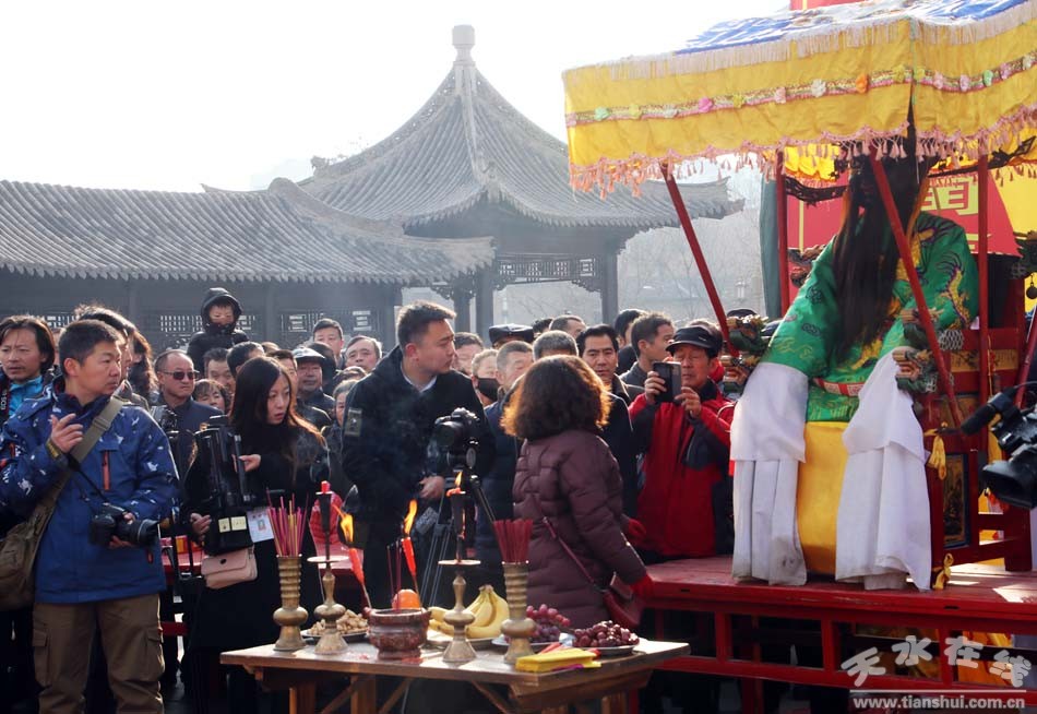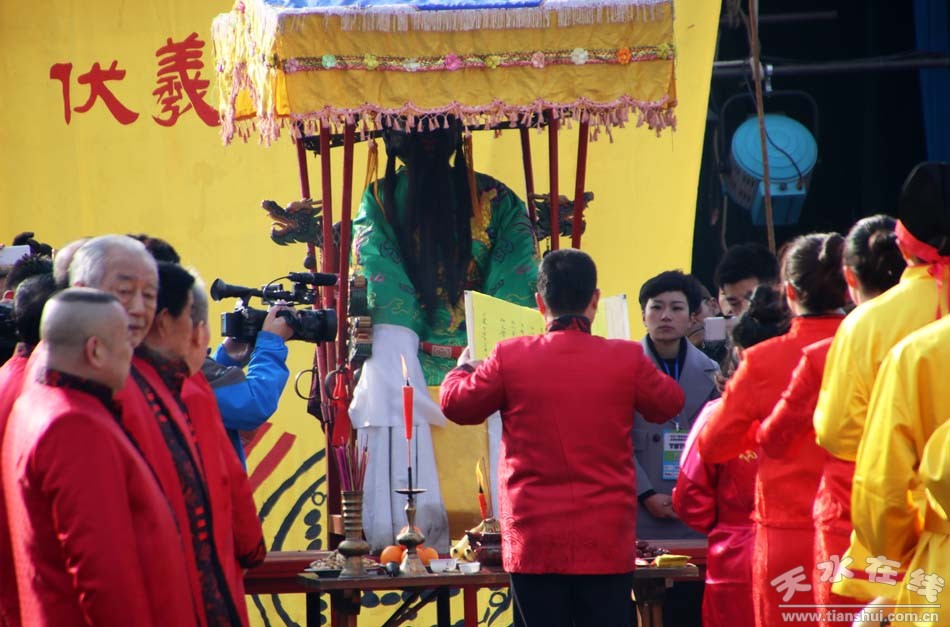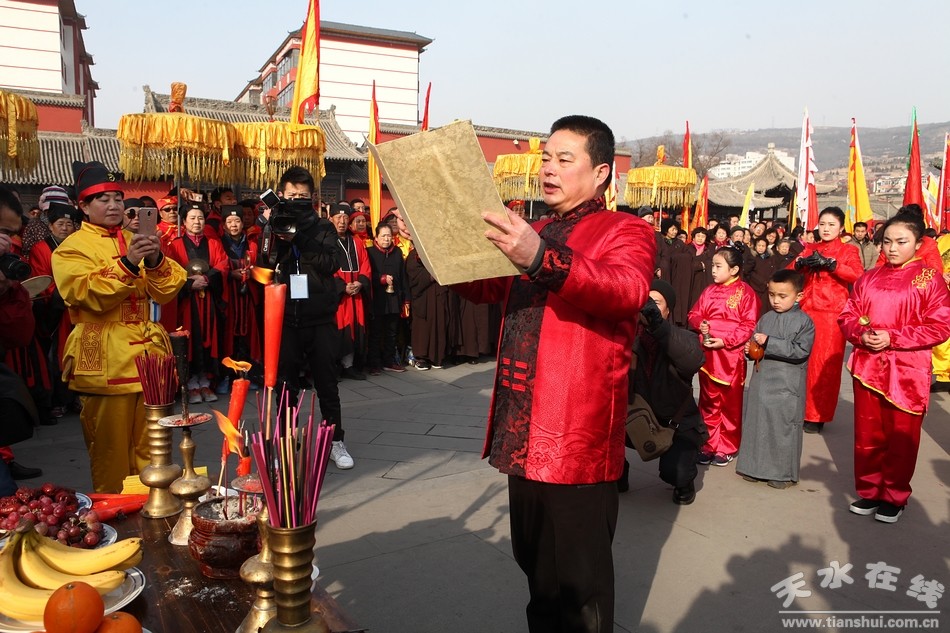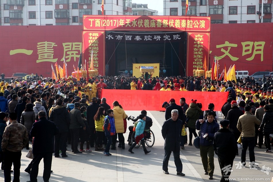 2月9(农历正月十三)日,吉祥中华—丁酉(2017)年天水伏羲庙春祭伏羲活动举行祈福纳祥迎圣水仪式。取水供圣仪式结束后,在伏羲庙大门对面的戏楼前举行了出榜文仪式。之后,方神黑爷像在浩浩荡荡仪仗队伍的“护驾”下“巡游”伏羲城。随后,仪仗队伍来到伏羲广场,将黑爷像安坐于祭祀伏羲广场正北新搭建的临时大舞台前举行迎神仪式。主祭人将刚刚迎取的吉水供奉于像前,以香蜡、黄表、清茶敬献,之后供奉圣水,以保佑中华吉祥,并将供过的圣之水洒向大地、洒向万民,以祈祷福佑中华,国泰民安,五谷丰登。同时,祝福天水大地风调雨顺,万民安康。