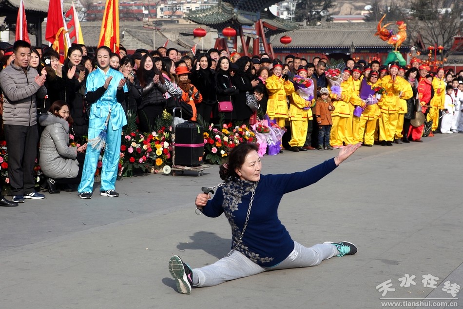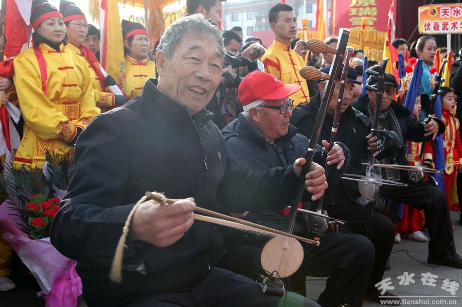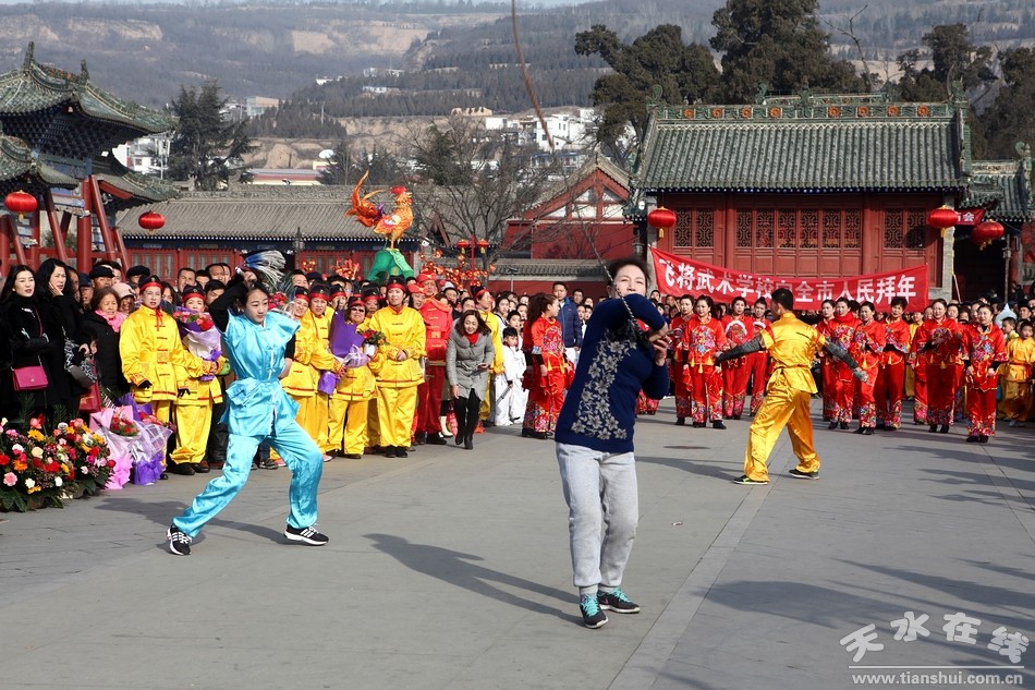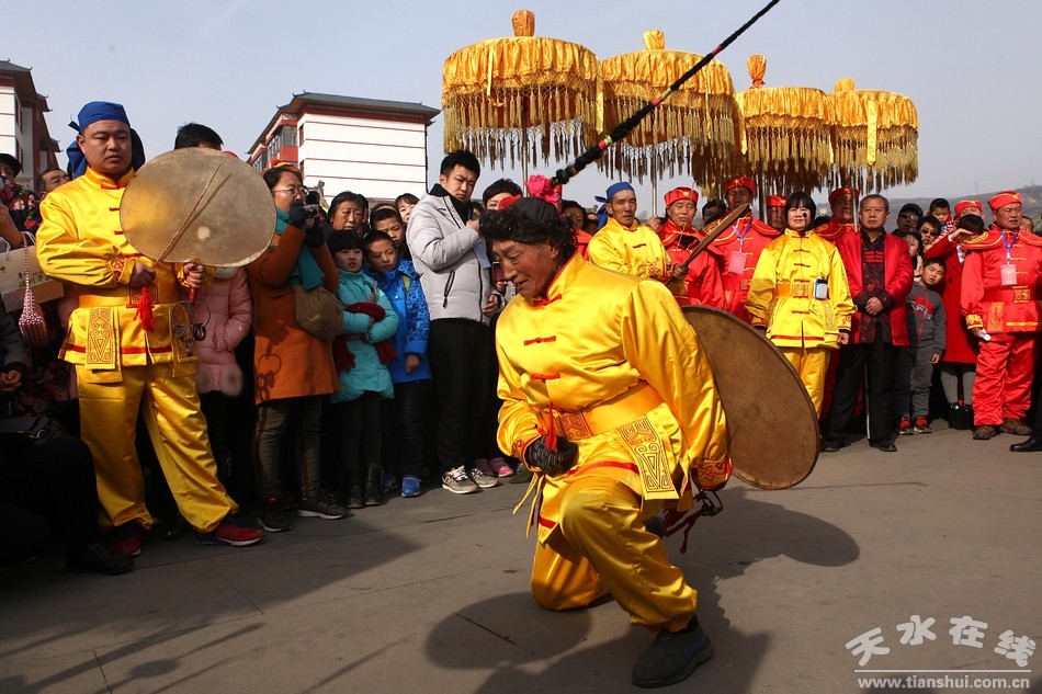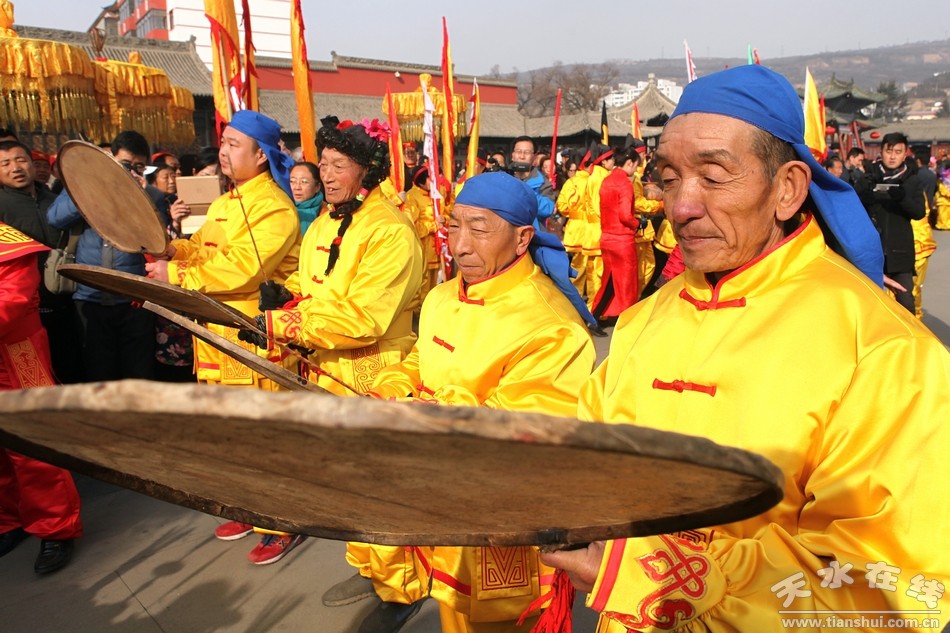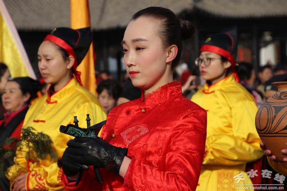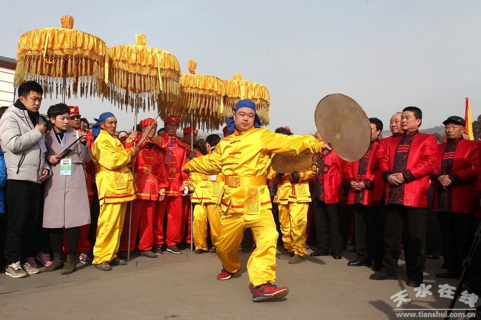 2月9(农历正月十三)日,吉祥中华—丁酉(2017)年天水伏羲庙春祭伏羲活动举行祈福纳祥迎圣水仪式。取水供圣仪式结束后,在伏羲庙大门对面的戏楼前举行了出榜文仪式。之后,方神黑爷像在浩浩荡荡仪仗队伍的“护驾”下“巡游”伏羲城。随后,仪仗队伍来到伏羲广场,将黑爷像安坐于祭祀伏羲广场正北新搭建的临时大舞台前举行迎神仪式。主祭人将刚刚迎取的吉水供奉于像前,以香蜡、黄表、清茶敬献,之后供奉圣水,以保佑中华吉祥,并将供过的圣之水洒向大地、洒向万民,以祈祷福佑中华,国泰民安,五谷丰登。同时,祝福天水大地风调雨顺,万民安康。