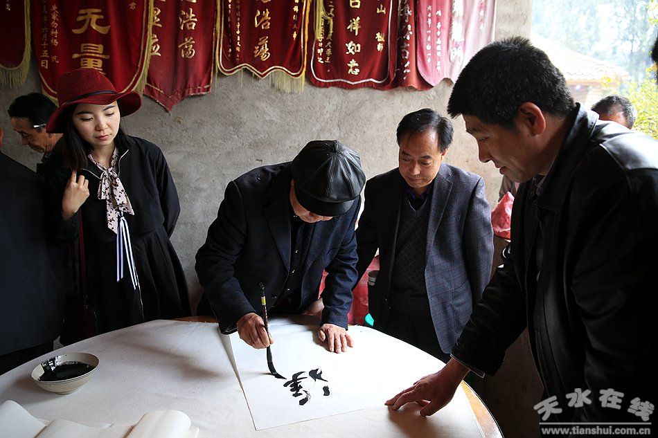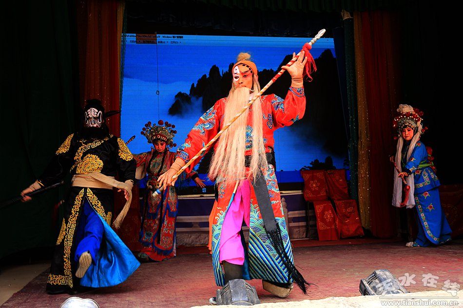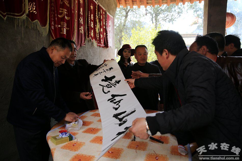 走进寺院,迎面是一座大殿,四周各一座小殿,院子里几颗刚长出嫩叶的小树随风摇摆着,小树旁几个大爷吹着唢呐,敲着鼓,打着镲,认真忘我地演奏着古老质朴的音乐,一副演绎气派像模像样,简直一支专业的老年乡村乐队,分分钟就吸引了不少人围观。再往后走,只见大殿前人们蜂拥而至,围着两张大圆桌来回拥挤着,原来是两位天水市书协的老师在此挥毫洒墨,倾情创作,现场为当地的乡亲们作书写字,大家热情满满,都希望能借此讨来一两幅老师的书法作品。寺院外的秦腔相继上演,戏台周围的小摊似乎更受欢迎,帅哥、姑娘们吃着小吃凑着热闹,小孩子拿着新买的玩具心满意足,即使到了中午饭点也丝毫不会影响乡亲们的热情。看到这一座小小的寺庙和一个不大的戏台却引来这么多赶庙会的乡亲如此热火朝天,小编问了问一位大妈才知道,原来这三岔五龙山文化庙会是由三岔镇的新岔村、史家勿村、北峪村三个村子联合举办的,每年农历三月初三是庙会正会的第一天,这天大戏开唱,村民们前来拜佛祈福,不仅这三个村子里的村民们来此赶庙会,远处的村民也会趁着这一年一度是庙会来五龙山上看看戏,串串门,乡里乡亲一起热热闹闹只为图个喜庆。
