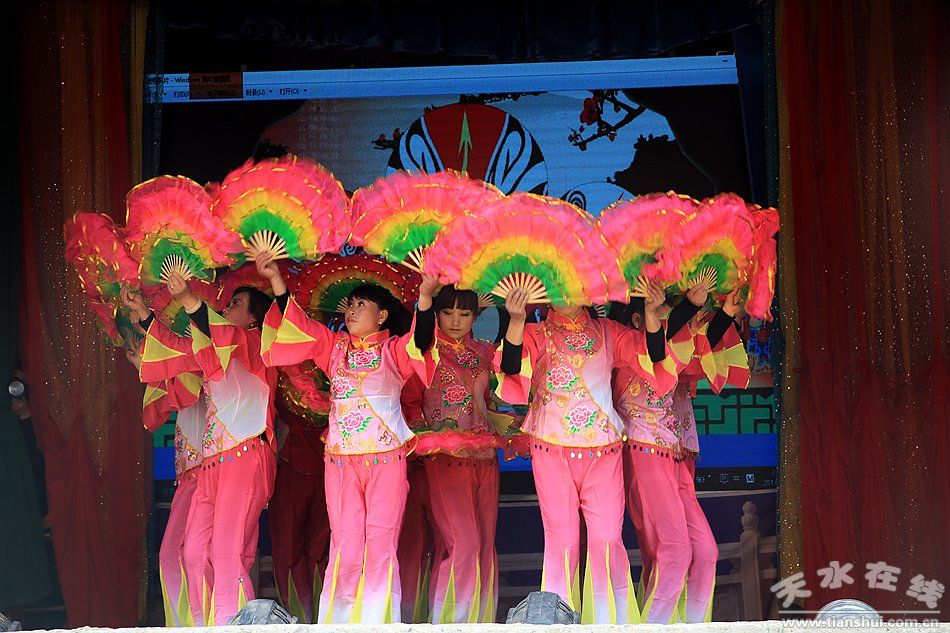下午两点左右,秦腔演绎告一段落,然而,五龙山庙会的重头戏才即将准备激情上演。画着浓妆,穿着华丽戏服的演员们已准备就绪,随着两位美女主持铿锵有力的一句“五龙山文化庙会艺术表演现在开始……”,音乐随即响起,小朋友们兴奋地跑上舞台,摇着头,扭着屁股,一曲“开门红”将庙会的文化表演拉开帷幕。随后,大妈们一个个身穿艳丽的舞衣,拿着鲜红的扇子,又一曲别样的“开门红”将五龙山庙会渲染的更是红红火火,热闹非凡。抬头远望,半坡上、山尖上,甚至树梢上,但凡能站人的地方无一空缺,一片人山人海,一片如火如荼。乡亲们自编自导自演的文化表演不仅给传统的文化庙会增添了新的色彩,更加引人入胜,大家热情饱满的舞蹈演绎,更是折射出现在农村人的生活越来越趋向于现代化,越来越富有幸福感,农村人的日子也是越来越红火。