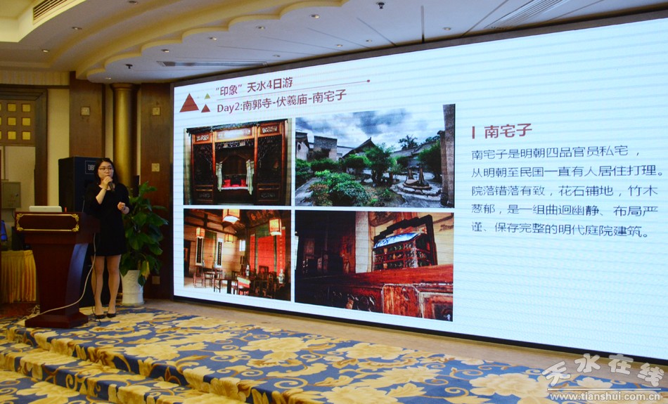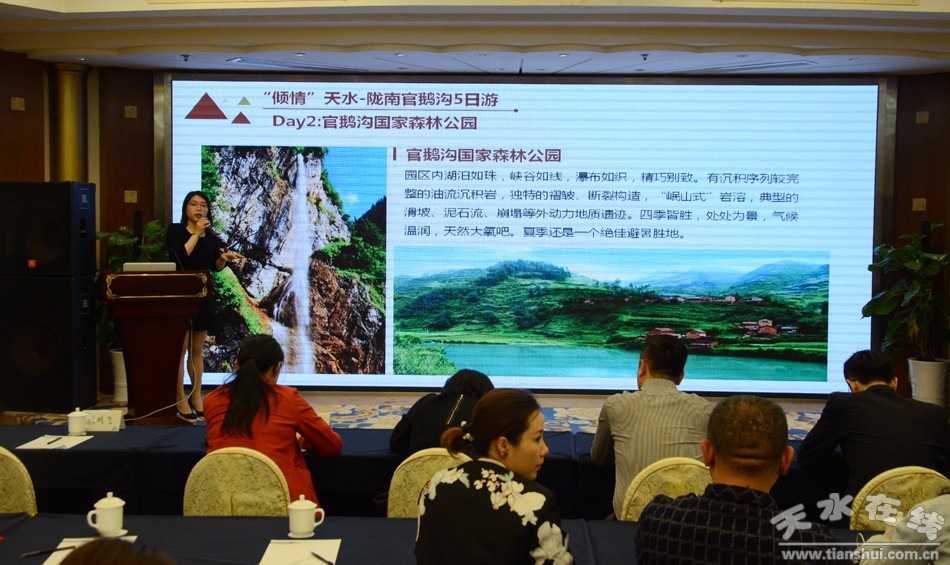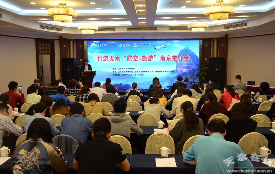 4月25日下午,行游天水“航空+旅游”南京推介会在南京山水大酒店举行。天水市文化和旅游局、西部机场集团天水机场有限公司及华夏航空公司相关负责人,南京市100余家旅行社代表、10余家机票代理商、30余家主流媒体记者,以及天水部分旅行社代表,市属媒体的记者共计120余人参加了推介会。