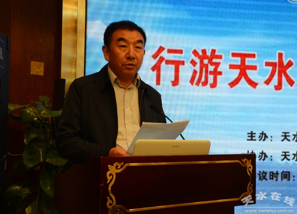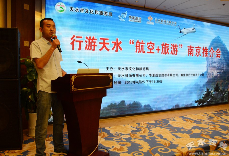 天水市文化和旅游局副局长傅小春在致辞中首先对出席推介会的旅游界、民航界、新闻界的来宾表示了热烈欢迎,并简要介绍了天水市市情和天水市旅游产业发展情况。他指出,南京作为首批中国优秀旅游城市和长三角辐射带动中西部地区发展的国家重要门户城市,以它灿烂的文化,博大的胸怀吸引着海内外的游客,也深受天水人民的青睐。自古以来,美丽富饶的南京和历史厚重的天水在商贸往来、文化交流等领域互通有无、互惠互利,结下了不解之缘,此次天水机场联合华夏航空公司开通的天水=南京直达航线,打开了天水地区通往长江三角地区的空中通道,进一步满足了天水市对外交流需求,扩大了天水的知名度和影响力,也为长江三角地区旅客进入天水旅游提供了一份更加便捷的选择。他强调,这次我们借天水=南京新航线开通之际举办“行游天水‘航空+旅游’南京推介会”,是学习南京发展经验、加强两市交流、宣传推介天水的一次良好机遇,必将对南京天水两市增进友谊、深化合作、共谋发展起到积极的推动作用。他希望借助此次推介会,为即将到来的五一小长假拉动旅游市场,也为即将开通的宝兰客运专线起到助推作用。