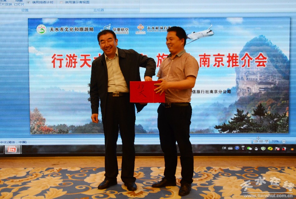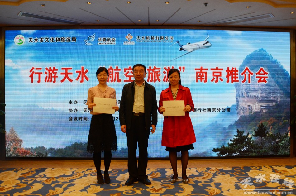本次推介会旨在充分利用天水=南京航线开通的有利契机,积极开拓和培育南京旅游航空市场,有效提升两市旅游交流合作水平,有力推动两市旅游业界务实合作,全力促进两市旅游航空市场互动发展。推介会上,我市还播放了《印象天水》旅游宣传短片,推介了天水旅游资源及相关产品,发布了旅游和航班优惠政策,两市重点旅行社签订了合作协议。本次推介会最终达到了宣传天水、推介旅游、营销航班、增进友谊、加强交流、务实合作的目的。