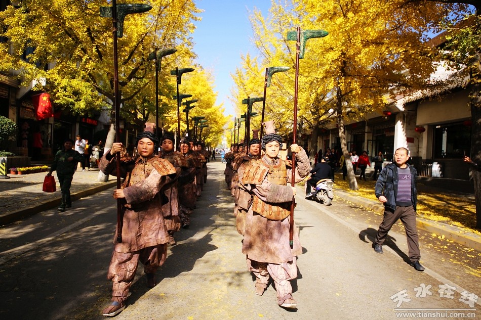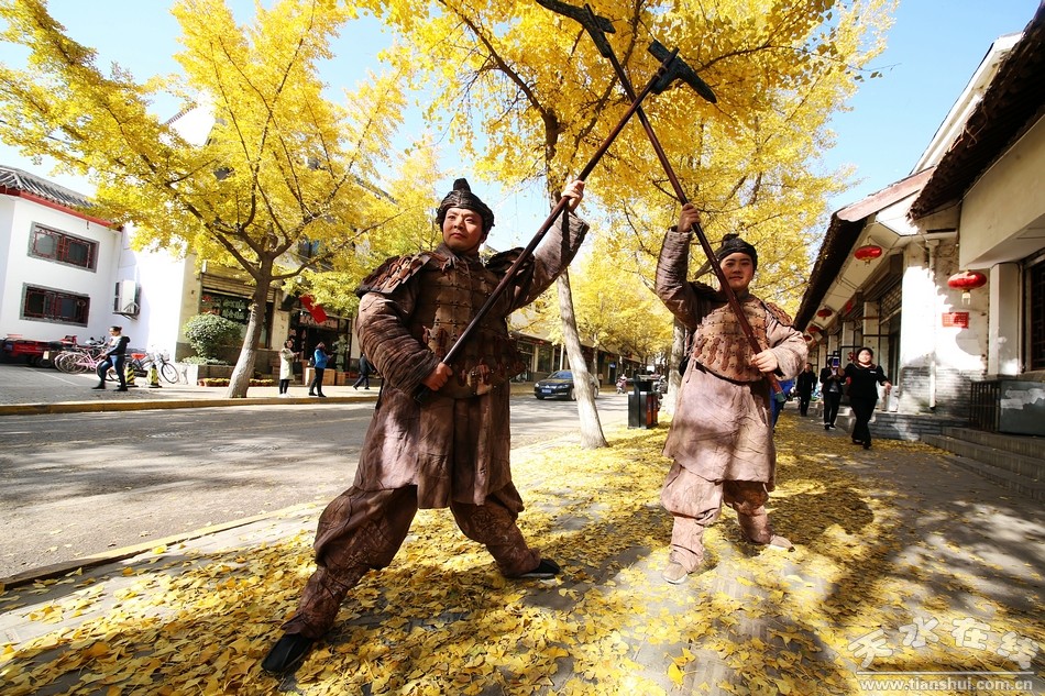 被秋日染得金黄的银杏叶,已经不知不觉铺了满地。阳光依旧透过枝杈撒下温暖的斑驳,金黄的叶子被一阵风吹得沙沙作响。或驻足或行走的天水人蓦地发现,远处身披铠甲、整齐庄重的“大秦勇士”正在铿锵走来。